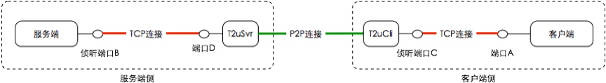 P2P 客户端)创建一个代理 TCP 侦听端口 C ,在创建代理 TCP 侦听端口 C 时,告诉 T2uCli ,要连接服务端的侦听端口 B , T2uCli 随后立即与 T2uSvr (即 P2P 服务端)创建一个 P2P 连接。然后,客户端就象之前直接连接服务端侦听端口 B 一样,连接 T2uCli 的侦听端口 C ,使用原来的协议和流程与侦听端口 C 进行交互, T2uSvr 会立即创建使用端口 D 的 Socket 与服务器侦听端口 B 建立 TCP 连接,并且将客户端发过来的数据原封不动地转发给服务端。